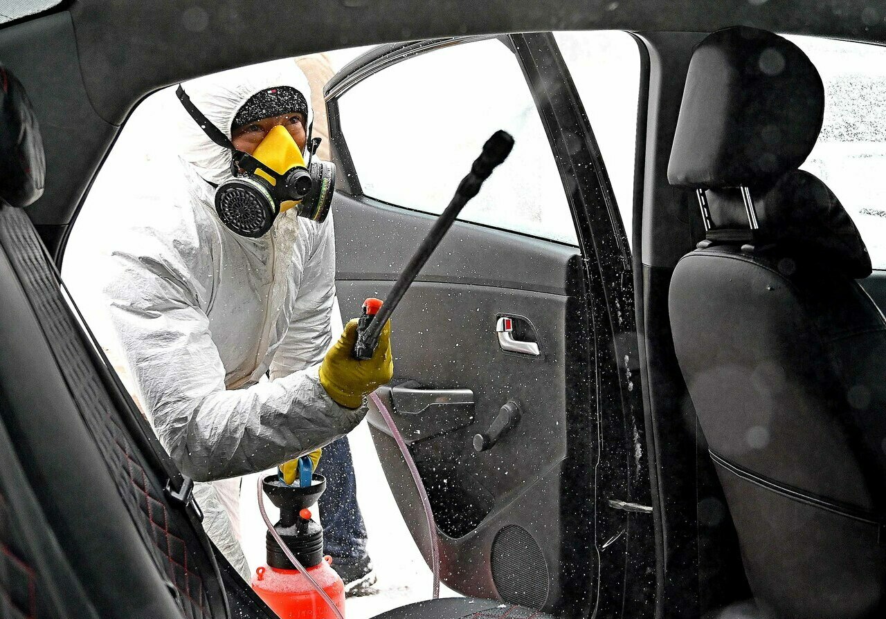 Обработка такси против коронавируса и других инфекций. Дизинфекция На фото: Андрей Абдувахидов
