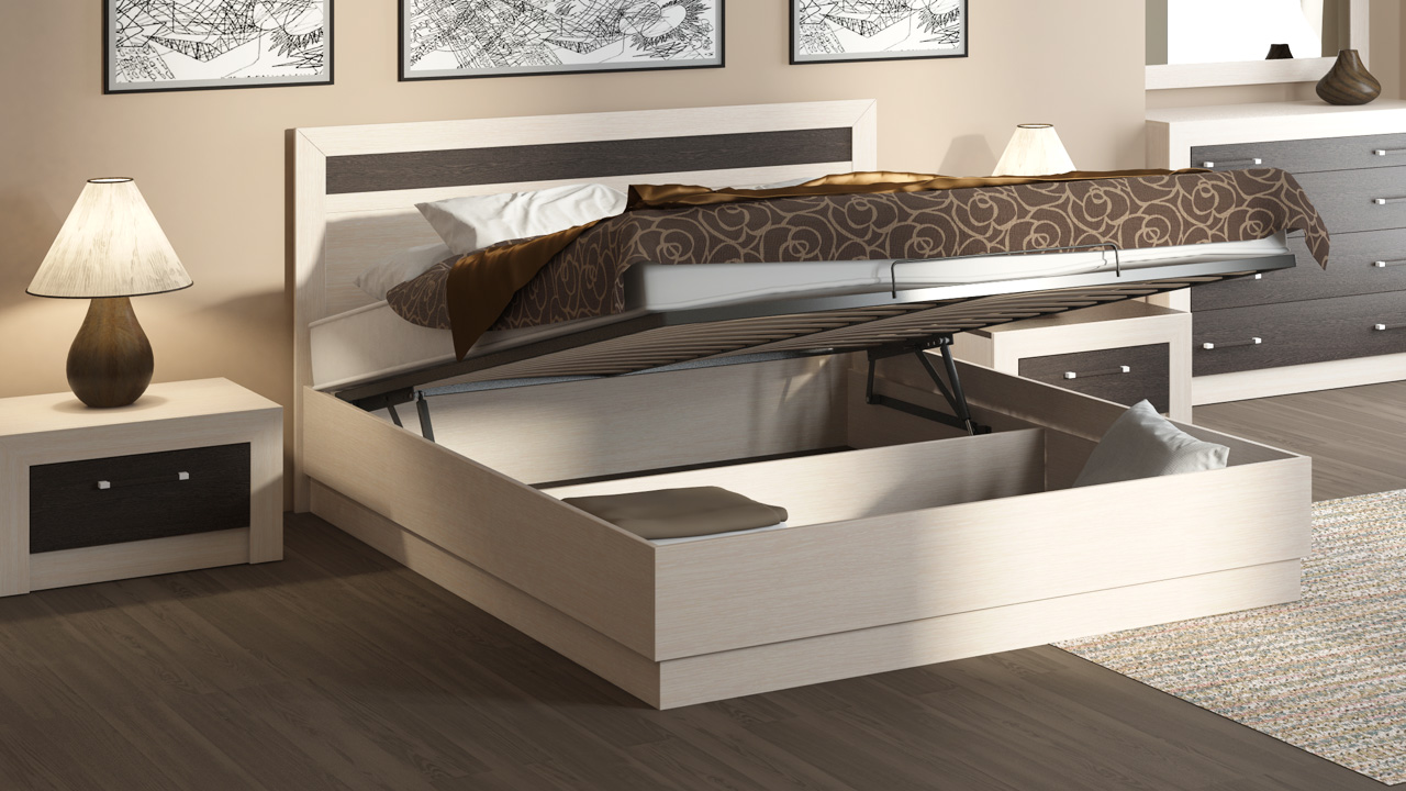 Раскладная кровать сочетает в себе двойную функцию удобного спального места и вместительного шкафа. Ящик для хранения находится под основанием кровати и занимает ту же площадь, что и кровать. Такие системы хранения более компактны, чем кровати с выдвижными ящиками – площади комнаты могут быть не полностью пригодными для использования. Поэтому кровати с подъемным механизмом пользуются большой популярностью у покупателей.